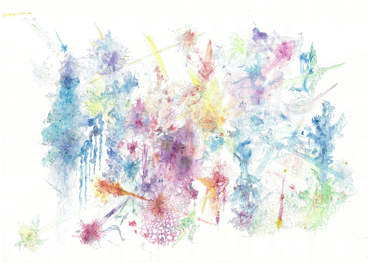 Automatic drawings โ a process of creation made famous by the surrealists, is used as a way to access imagery from deep within the subconscious. Paula Friss applies this process to all aspects of her work, resulting in a final product that presents many fluid paths of seductive pareidolic colours and shapes.
