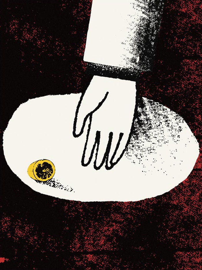 A striking example of Alexanderโs work is the illustration Lemon Hand, which was made when he worked at Critic magazine. The work features a hand reaching for a very small lemon, tucked away in the corner of a plate. The hand literally fades away into the rusty background. This was an illustration for an article about lemon detox diets. Lemon Hand shows Alexanderโs ability to squeeze emotion and feeling into his depictions of a simple action.