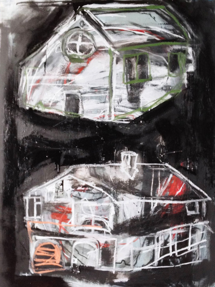 Care is taken by Friis not to create a recognizable storyboard when choosing from her library of shapes to collate together in her collages. It is only once these collages are complete that the infinite possibilities of a pictorial language begin to evolve into a storyboard. The beauty of this is that often the story the artist will see is not the same as the observer. Everyoneโs response is unique.