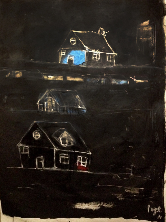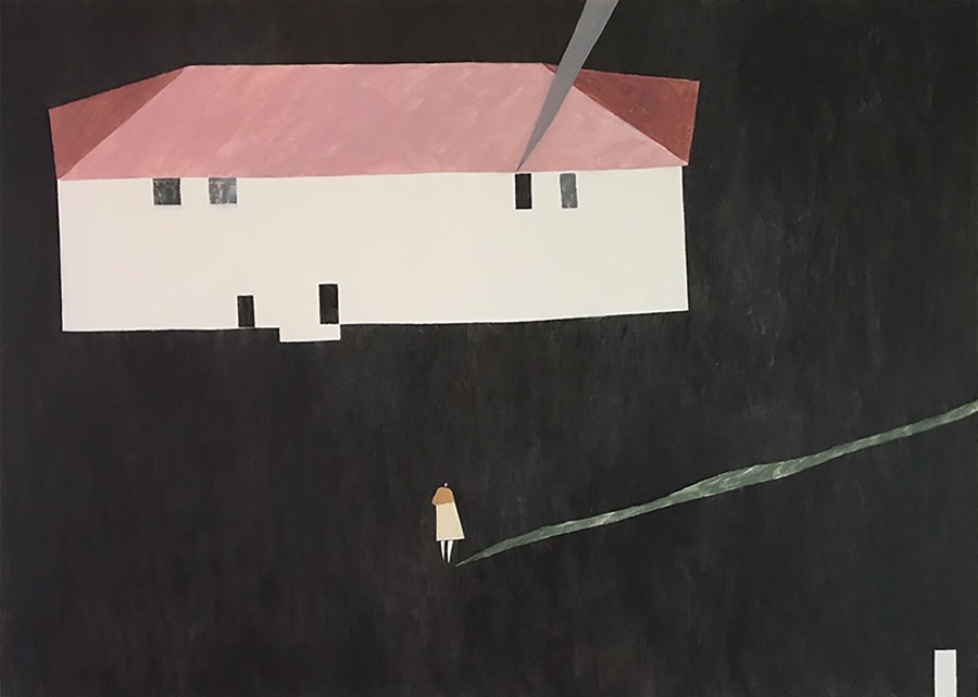 In his work we see large dogs scribbled in black, homely settings with doors that you can practically hear creaking, human bodies filling the frame in a way thatโs a little bit less than human. His work all seems to take place in a void, a surreal world reminiscent of Courage the Cowardly dog, the stuff of children’s nightmares but without being explicitly scary. Like all good horror settings, what makes his work uncomfortable is the stuff he doesnโt show you rather than what you can see.