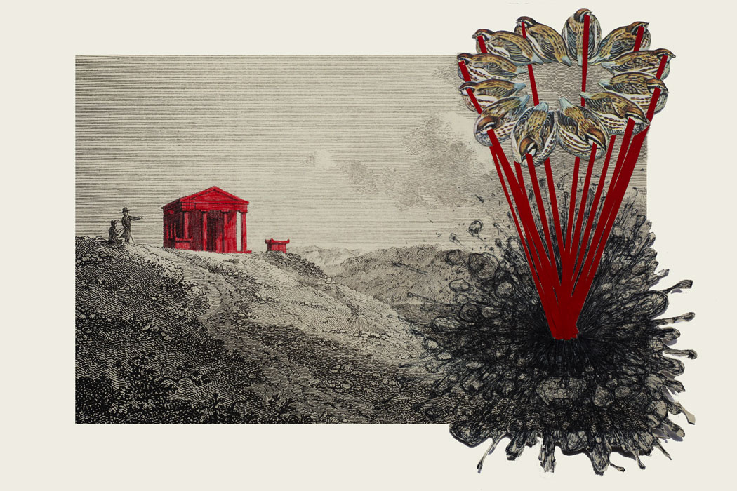 With its intimate honesty, her self-taught style embraces experimentation. Her recent collages are populated with animals which, for Aitchison โfeel like a more pure representation of humanity, not clogged with the trappings of society or defined by strange, abstract concepts such as religion or politics or capitalism.โ Sourced from a bunch of books scored at the infamous Regent 24 Hour Book Sale, the collages were borne of a time of upheaval for the artist, when โI was in the process of leaving my marriage and turning my world upside down. I longed for nature to stage an uprising, to obliterate humanity so that we could start over, freshโฆ so I ended up creating it!โ