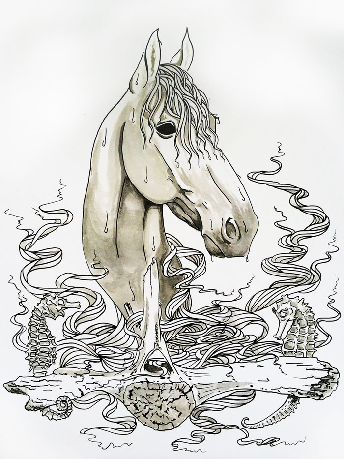 “I am an autodidact who specializes in drawing with ink, graphite and charcoal and painting in oil and water colour. My work is primarily representational and touches on themes of death, osteology, anatomy, feminism and isolation. I work during the day teaching art to adults with intellectual disabilities at an IDEA Services funded daybase, my aim being the mainstreaming of capable artists that I work with and fostering their own unique art practices.” โ Holly Aitchinson