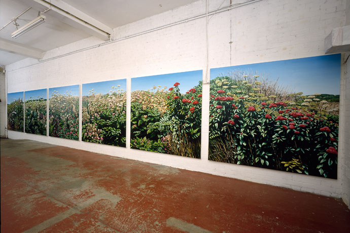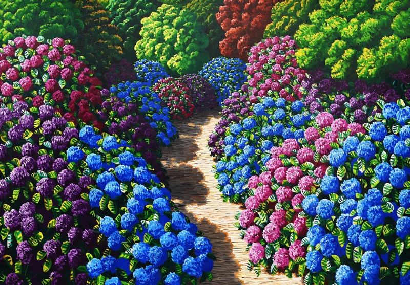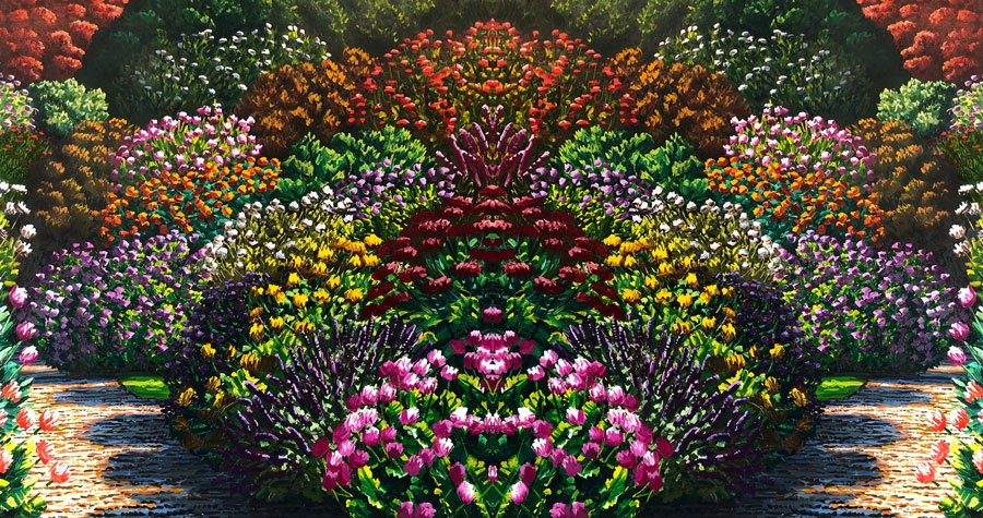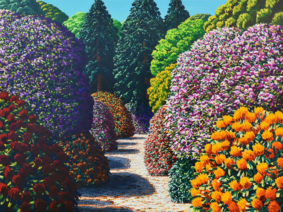 From a distance, Karl Maughan’s work is seemingly photorealistic, up closeย his workย is an expressive celebration of colour and paint; inviting you into surreal light-filled gardens of wonder.